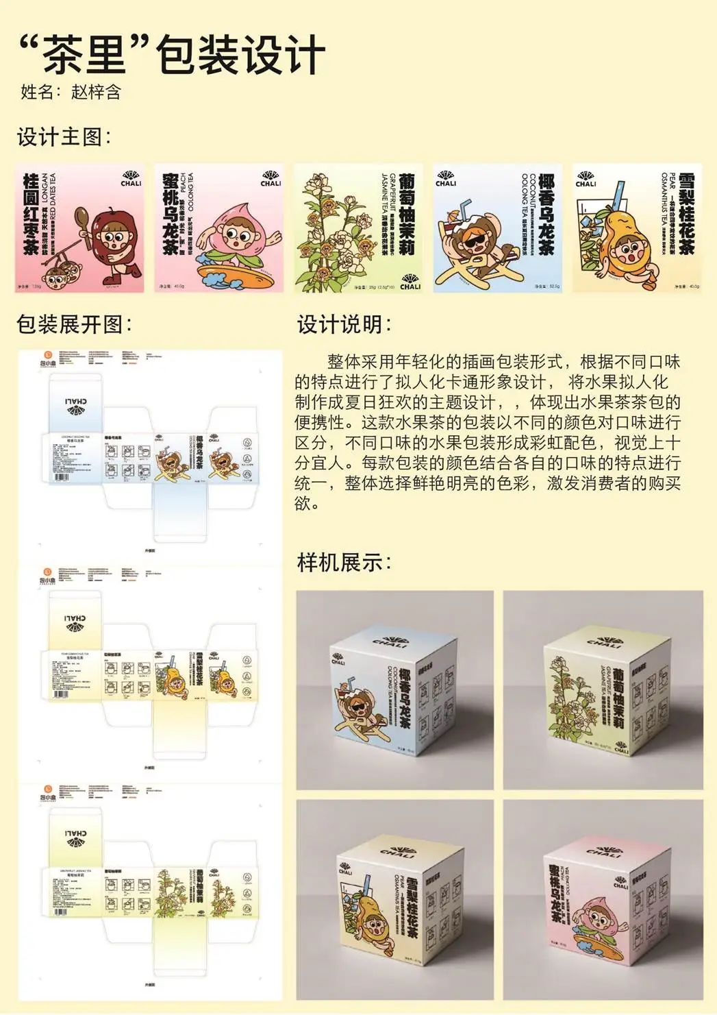 介绍:整体采用年轻化的插画包装形式,根据不同口味的特点进行了拟人化卡通形象设计,将水果拟人化制作成夏日狂欢的主题设计,,体现出水果茶茶包的便携性。这款水果茶的包装以不同的颜色对口味进行区分,不同口味的水果包装形成彩虹配色,视觉上十分宜人。每款包装的颜色结合各自的口味的特点进行统一,整体选择鲜艳明亮的色彩,激发消费者的购买欲。