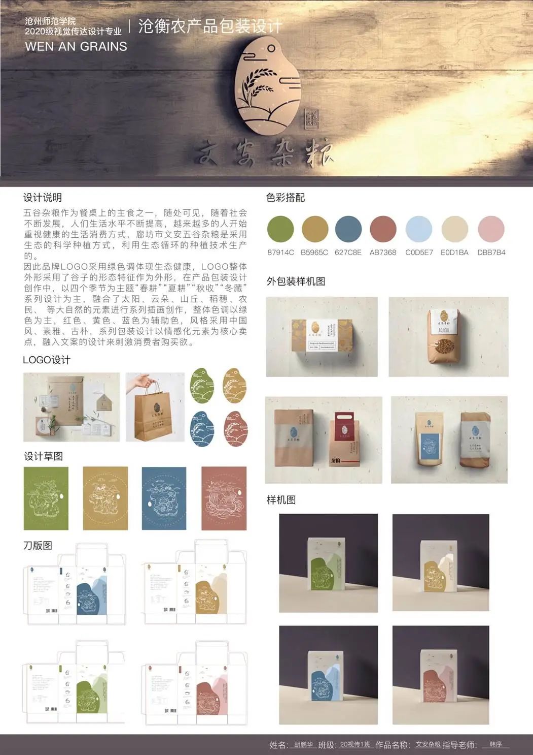 介绍:五谷杂粮作为餐桌上的主食之一,随处可见,随着社会不断发展,人们生活水平不断提高,越来越多的人开始重视健康的生活消费方式,廊坊市文安五谷杂粮是采用生态的科学种植方式,利用生态循环的种植技术生产的。因此品牌LOGO采用绿色调体现生态健康,LOGO整体外形采用了谷子的形态特征作为外形,在产品包装设计创作中,以四个季节为主题“春耕”“夏耕”“秋收”“冬藏”系列设计为主,融合了太阳、云朵、山丘、稻穗、农民等大自然的元素进行系列插画创作,整体色调以绿色为主,红色、黄色、蓝色为辅助色,风格采用中国风、素雅、古朴,以系列包装设计以情感化元素为核心卖点,融入文案的设计来刺激消费者购买欲。