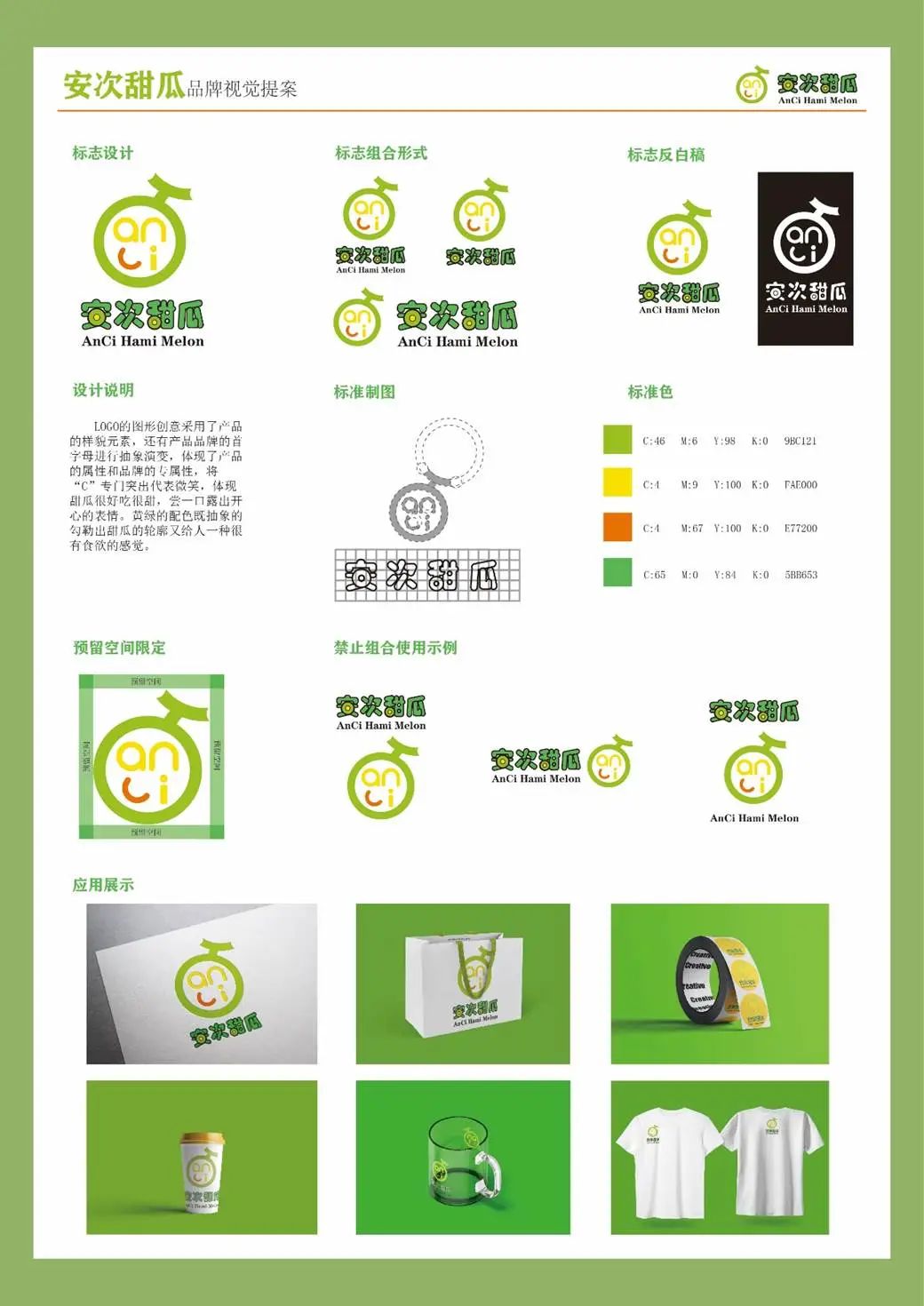 LOGO的图形创意采用了产品的样貌元素,还有产品品牌的首字母进行抽象演变,体现了产品的属性和品牌的专属性,将“C”专门突出代表微笑,体现甜瓜很好吃很甜,尝一口露出开心的表情。黄绿的配色既抽象的勾勒出甜瓜的轮廓又给人一种很有食欲的感觉。