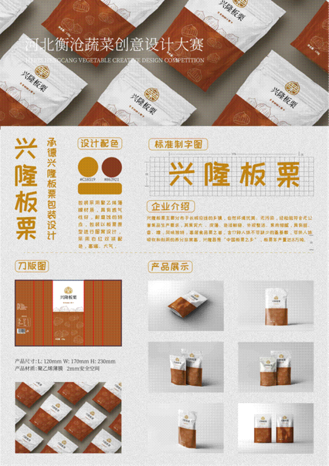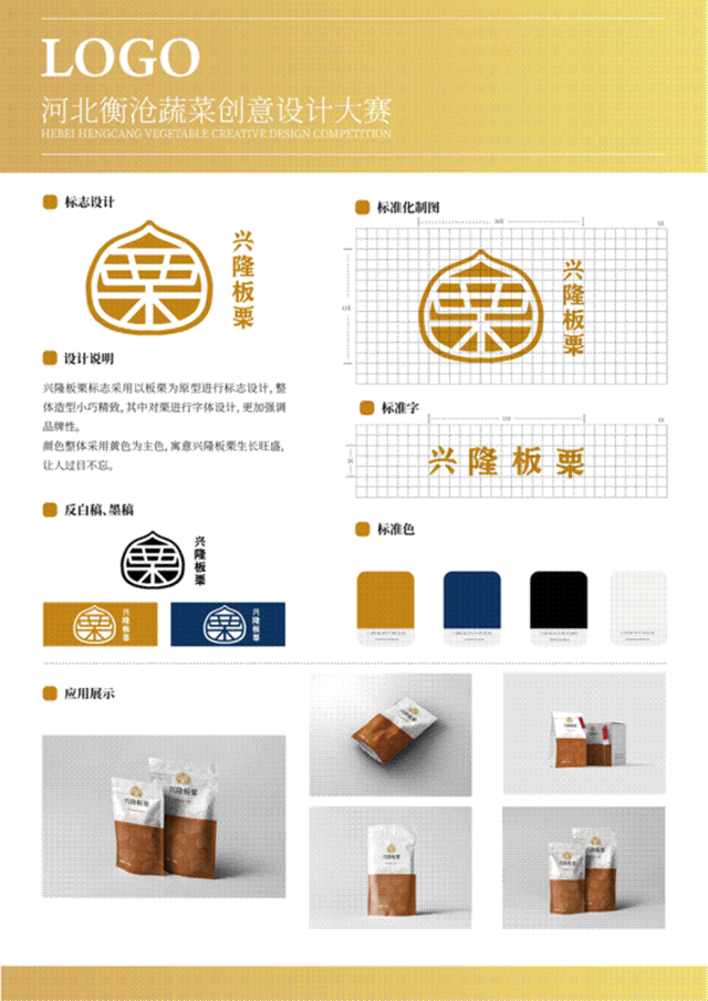 介绍:兴隆板栗标志采用板栗为原型进行标志设计,整体造型小巧精致,其中对栗进行字体设计,更加强调品牌性。