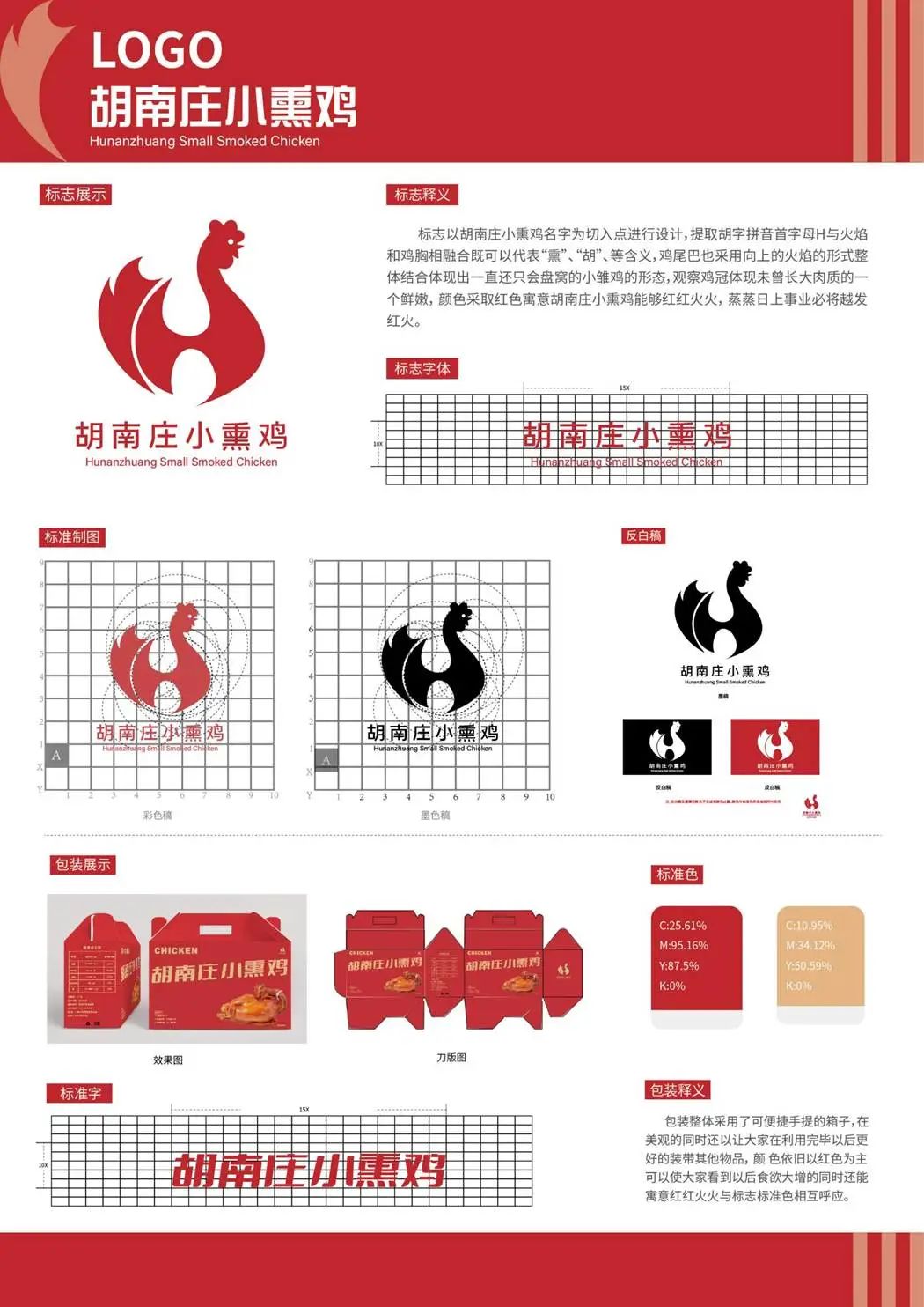 介绍:标志以湖南小熏鸡名字为切入点进行设计,提取胡字拼音首字母H与火焰和鸡胸相融合即可体现烧鸡“熏”字所在、又可体现“胡”等含义,从形态上看鸡尾巴采用向上的火焰的形式来体现出一种蓬勃积极的精神与此同时更加加深了读者的记忆,与整体结合体现出一只还只会窝盘的小雏鸟的形态,结合幼小的鸡冠体现肉质采用的鲜嫩,色彩上采取以红色为主的颜色寓意胡南庄小熏鸡能够红红火火长久的发展下去,蒸蒸日上的事业必将越发红火。