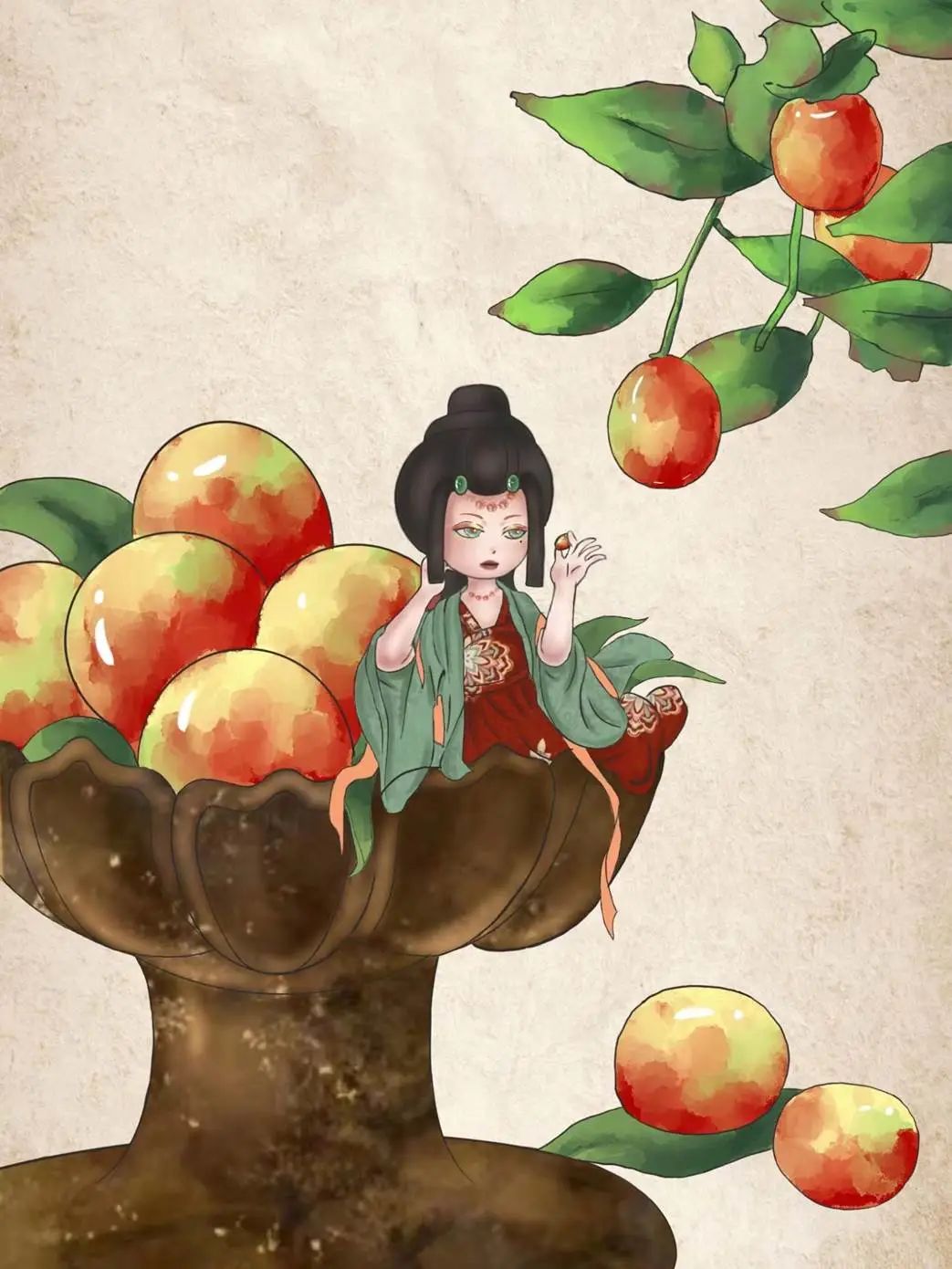 介绍:沧州冬枣的种植历史可追溯到秦汉时期。便采用了当时所朝代的传统服饰与发型,采用冬枣的红绿黄为衣服配色,增加与冬枣的相似度。手持冬枣枣枝而立以沧州标志性建筑清风楼为头饰,实现特产与文物的完美融合。