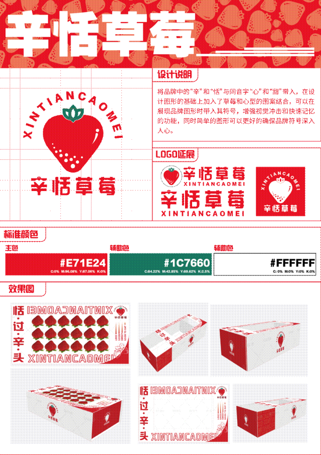 介绍:将品牌中的“辛”和“恬”与同音字“心”和“甜”带入,在设计图形的基础上加入了草莓和心型的图案结合,可以在展现品牌图形时带入其符号,增强视觉冲击和快速记忆的功能,同时简单的图形可以更好的确保品牌符号深入人心。
