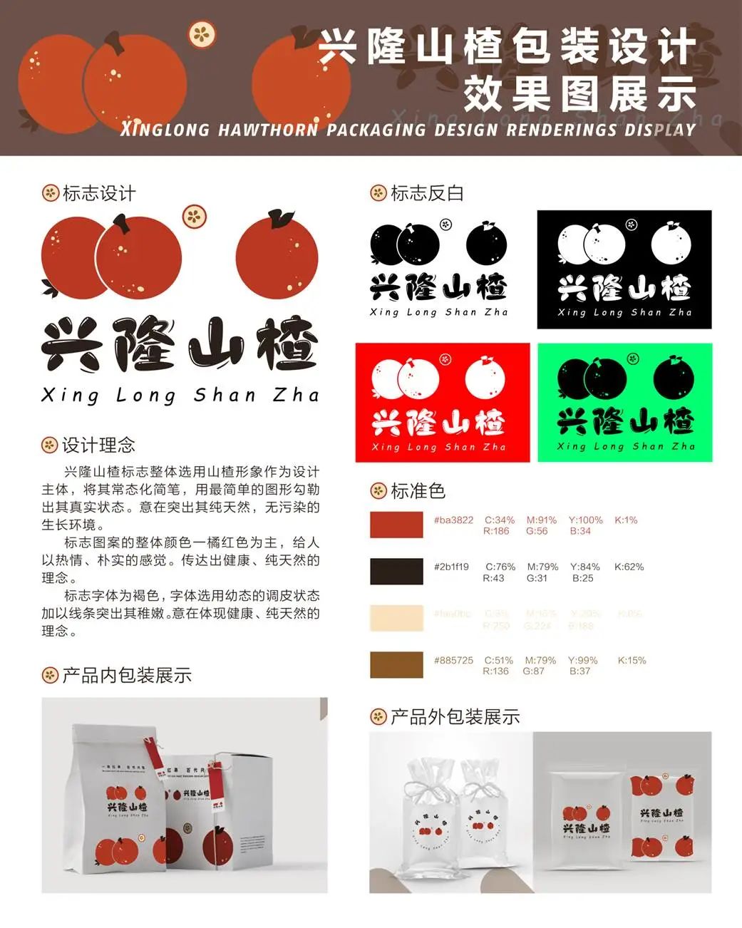 介绍:兴隆山楂标志整体选用山楂形象作为设计主体,将其常态化简笔,用最简单的图形勾勒出其真实状态。意在突出其纯天然,无污染的生长环境。标志图案的整体颜色一橘红色为主,给人以热情、朴实的感觉。传达出健康、纯天然的理念。标志字体为褐色,字体选用幼态的调皮状态加以线条突出其稚嫩。意在体现健康、纯天然的理念。