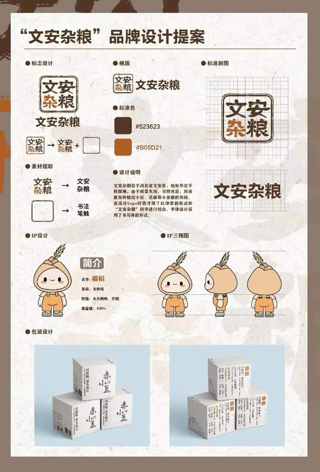 介绍:文安杂粮位于河北省文安县,地处华北平原腹地,由于雨量充沛,日照充足,历来就有种植红小豆,芝麻等杂粮的传统。在设计logo时我采用了以印章的形式和“文安杂粮”四字相结合,字体设计采用了书写体的形式。