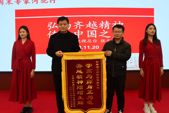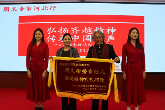 张文星代表原中央人民广播电台老播音员和花样少年语言艺术展演全国组委会向齐越教育馆赠送锦旗,齐越传媒学院院长张海燕接旗。