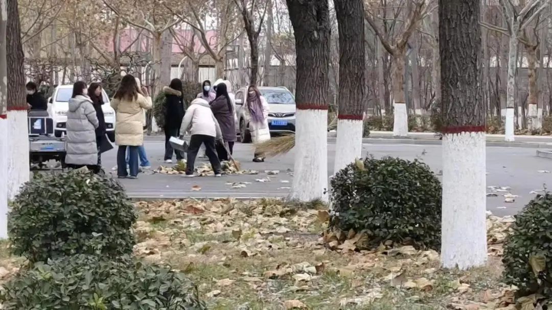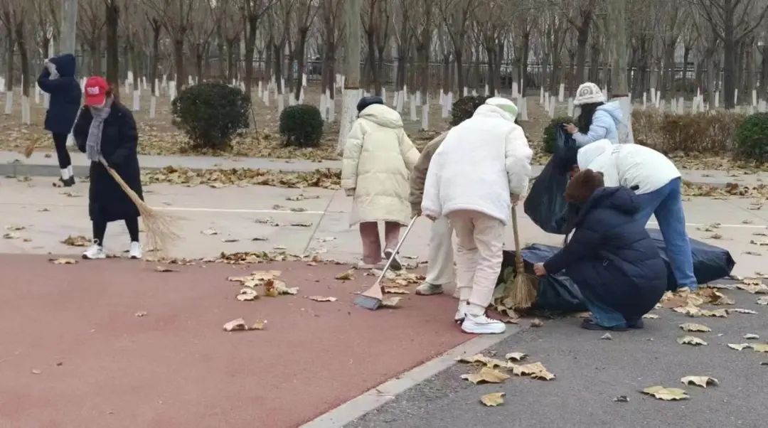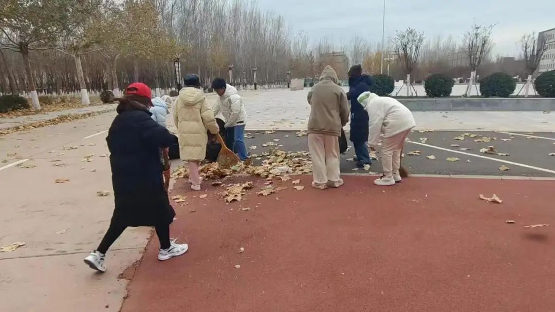 根据实践任务的需要,同学们分成了若干小组,他们拿着扫帚和簸箕,认真地清扫着每一个角落,细心地扫去落叶、纸屑、垃圾。大家不畏严寒,齐心协力,配合默契,忙碌的身影充满了活力与热情,构成了校园内一道亮丽的风景线。