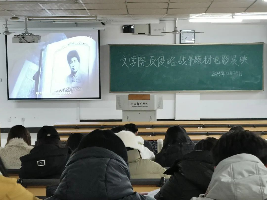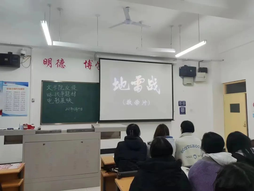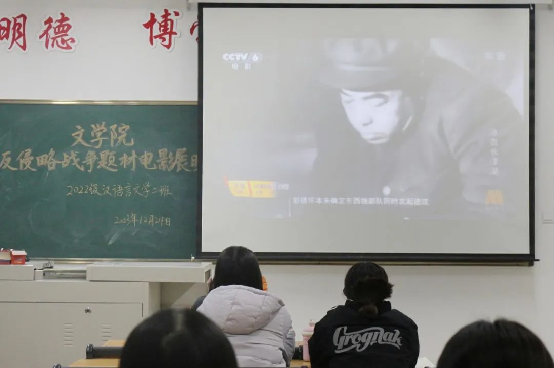 1930年12月25日,毛泽东同志首次提出游击战术思想,在后来的抗日战争中成为重要的战略方针,体现了人民群众的斗争热情和斗争智慧;1950年12月24日,位于朝鲜战场的长津湖战役胜利,彻底扭转了抗美援朝战争的战局,为最终到来的停战谈判奠定了胜利基础。为纪念毛泽东游击战术思想的提出和长津湖战役的胜利,文学院于12月24日、25日,开展反侵略战争题材电影展映活动,组织全体学生集体观看纪录片《冰血长津湖》、抗日电影《地雷战》等影片。