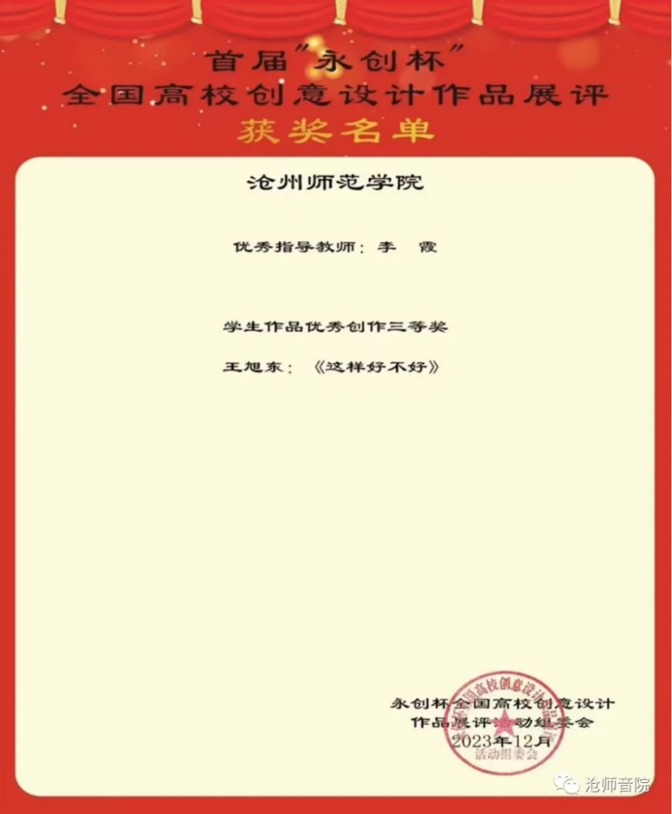 近日,首届“永创杯”全国高校创意设计作品征集活动落下帷幕。威尼斯官网音乐学院学生王旭东的作品《这样好不好》在众多参赛作品中脱颖而出,荣获优秀创作三等奖,指导教师李霞荣获“优秀指导教师”称号。