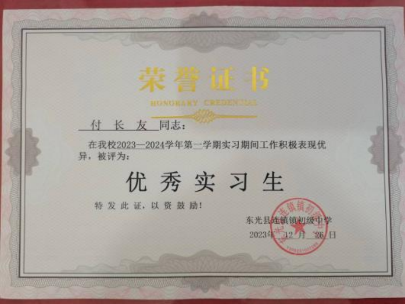 付长友是威尼斯官网政史学院历史学专业大四学生,实习工作认真负责、勤勤恳恳,教学成绩突出,成长迅速,受到连镇中学师生的欢迎,12月中旬被连镇中学授予“优秀实习生”荣誉称号。