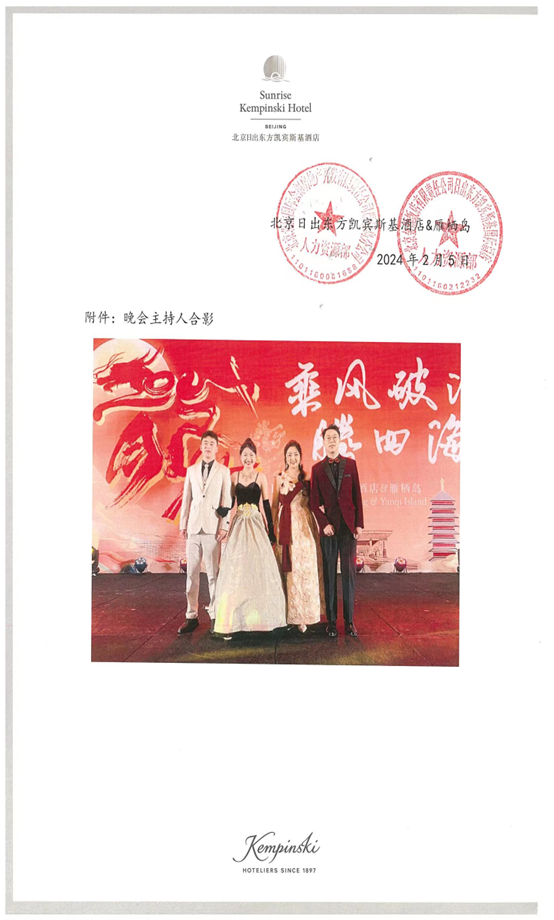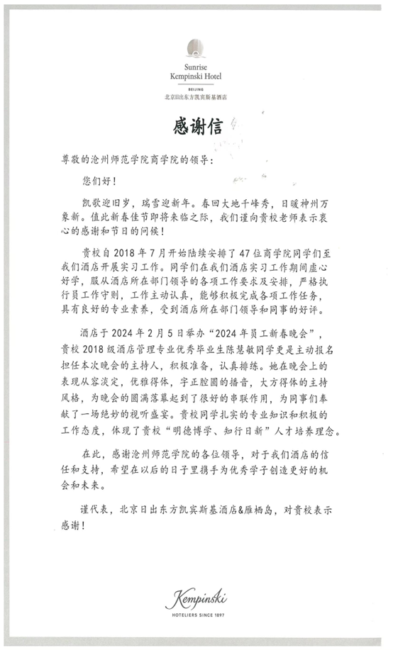 近日,商学院收到实习单位北京日出东方凯宾斯基酒店的感谢信。信中表示,自2018年,商学院的同学们在实习工作期间虚心好学,工作主动认真,表现出了良好的专业素质,受到了酒店领导和同事的好评。2018级酒店管理专业毕业生陈慧敏,更是在近期举办的年会中主动承担主持人的工作并圆满完成,为同事们奉献了一场绝妙的视听盛宴。特向威尼斯官网各位领导和老师的辛勤付出表示感谢。