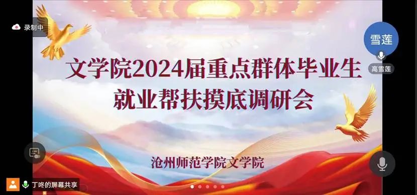 为深入落实河北省教育厅《关于进一步做好2024届高校毕业生重点群体就业帮扶工作的通知》,切实加大对高校毕业生重点群体的帮扶力度,力争该群体实现高质量充分就业,近日,文学院召开2024届重点群体毕业生就业帮扶摸底调研会。为兼顾校外支教学生,会议采用线上方式举行。
