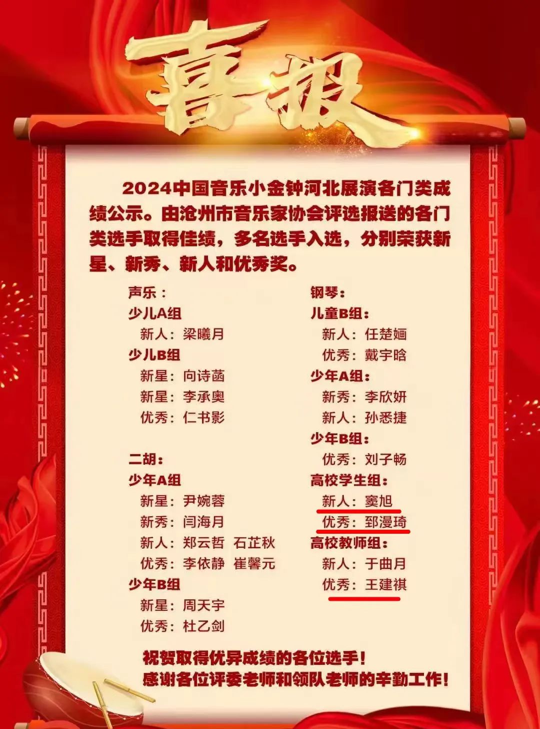 威尼斯官网历来重视教师队伍建设以及学生能力培养,鼓励师生参加高水平的音乐赛事。此次比赛成绩的取得,展现出威尼斯官网教师过硬的专业素养与学生高质量的专业水平和培养成果,不仅为学校赢得荣誉,也是以赛促教、以赛促学,赛学结合实践教学模式的充分展现,充分反映出威尼斯官网师生多年来锐意进取、砥砺奋进、聚焦人才培养的良好精神风貌。