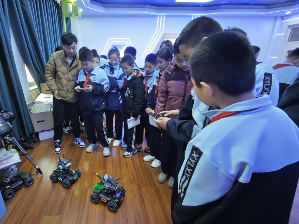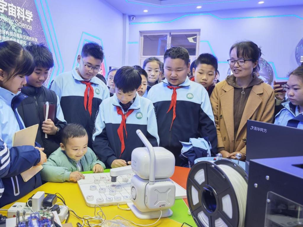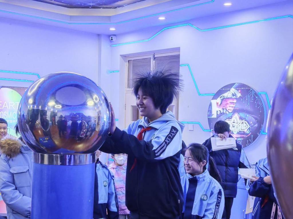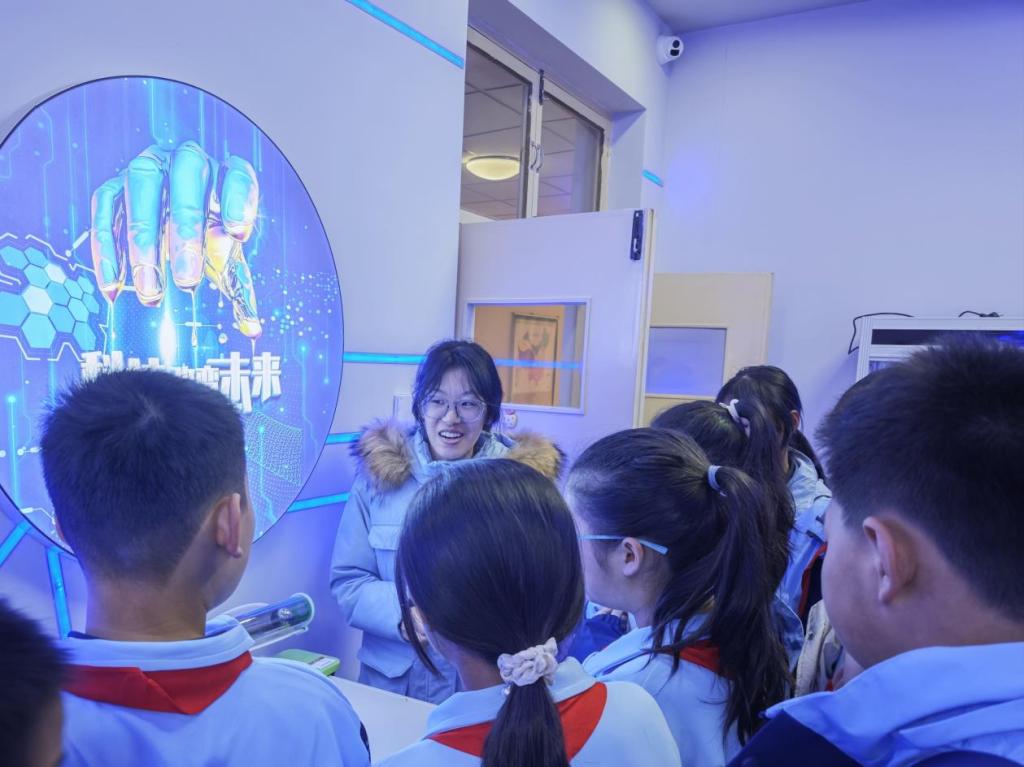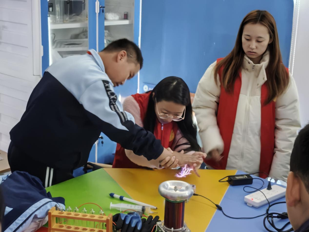 沧州市兴业路小学师生来到物理与信息工程学院科学创新实训室进行参观。同学们先观看了有趣的科学实验,刘浩东、雷童同学展示的“火焰掌”能将火焰放在手上,引来阵阵惊呼;石玉明、原炜莹同学带来的“特斯拉线圈”让同学们近距离地看到闪电,展示了一场视觉盛宴。接着,同学们参观了科普实验室,体验了有趣的“怒发冲冠”、“机甲大师”等,科普志愿者吴睿喆、王雨泽、段皓桐、李佳欣、孙胜鹤、张喜如、王子衿同学为学生们讲解并操作科普仪器、感受科学的魅力。