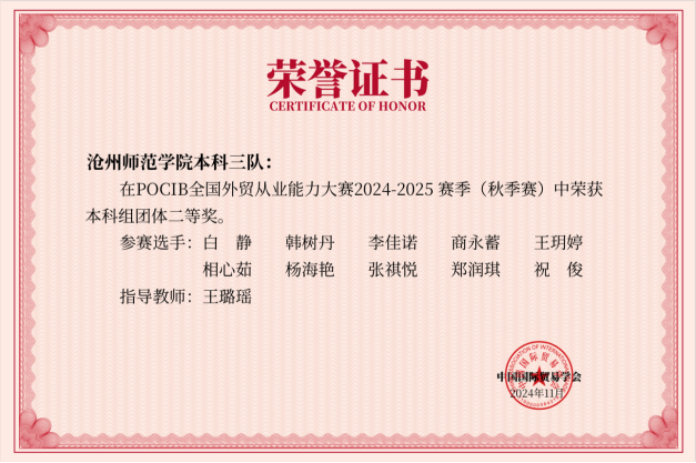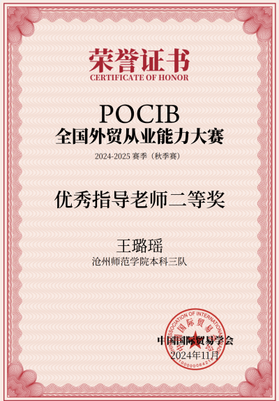 近日,中国国际贸易学会主办的第十四届POCIB全国外贸从业能力大赛(秋季赛)落下帷幕。。威尼斯官网商学院组建的十人参赛队伍,首次参加此次比赛。经过13天的比赛,商学院国际商务专业2022级学生王玥婷、白静、李佳诺、韩树丹、商永蓄、相心茹、杨海燕、张祺悦、郑润琪、祝俊,在教师王璐瑶的指导下,以扎实的专业知识、出色的表现和团队合作的精神,斩获全国团体二等奖,教师王璐瑶被组委会评为优秀指导教师。