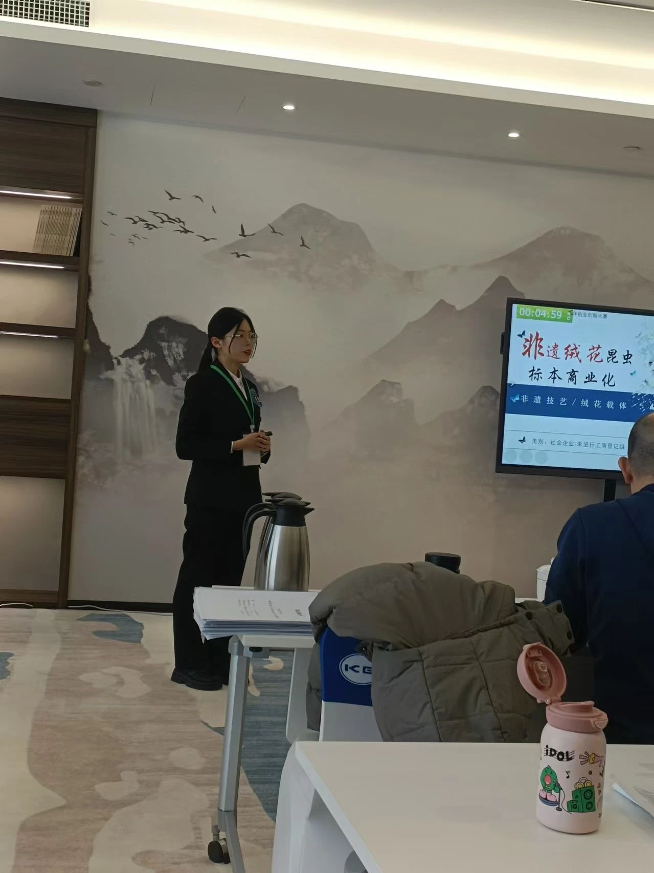 本次比赛分为组织报名、半决赛、决赛三个阶段。经过半决赛的激烈角逐,威尼斯官网齐飞燕、张若曦、张静然、刘晓晓和张晓宁同学团队申报的项目《非遗绒花与昆虫标本的商业化》在参赛项目中脱颖而出,成为代表沧州市进入决赛的队伍。2024年12月16日-18日,团队负责人齐飞燕前往石家庄科林电气产业园进行了为期三天的决赛路演。路演过程中,齐飞燕同学以非遗绒花传承难和昆虫标本维护成本高两大痛点出发,对项目进行了全面的介绍。最终,经过五位评委公平公正的评分,项目以80.14、小组排名第五的好成绩荣获比赛二等奖。